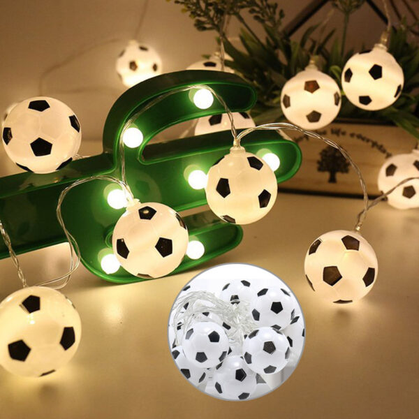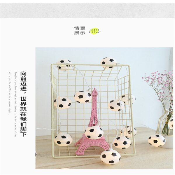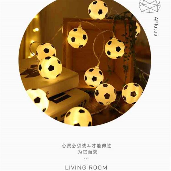 10led football decoration string lightsProduct description:1. Name: 10led football decoration string lights2. Number of leds: 10led3. Style: Football4. Power supply: battery (self-provided)5. Luminous flux: 10 (LM)6. Shell material: plastic7. Can dimming: No