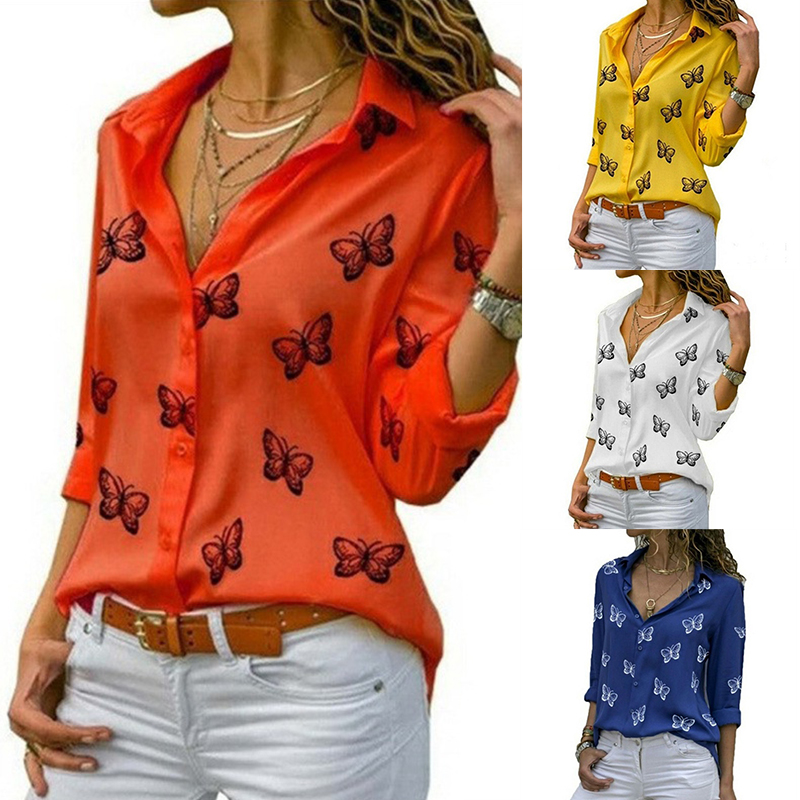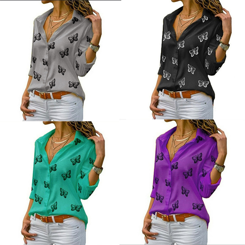 Fashion Butterfly Print Women Blouses Long Sleeve Turn-down Collar Blouse Shirt Casual Tee Tops Elegant Work Shirt