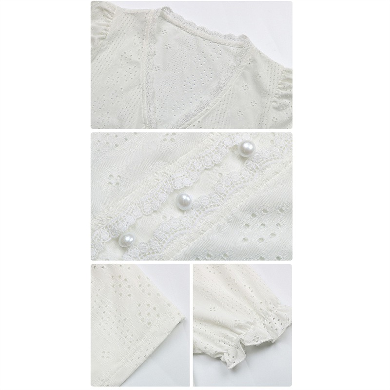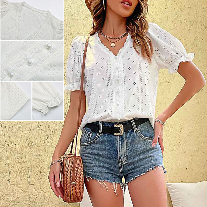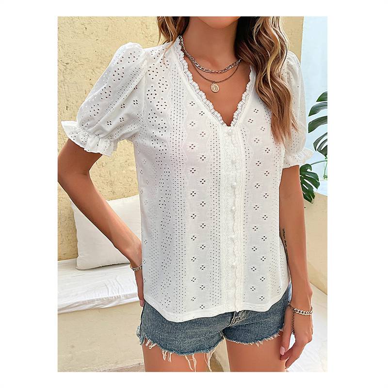 MiuKoMiYa Summer Princess Puff Sleeve Blouse Women 2024 Short Sleeve Shirts Hollow Out V Neck Top Women Blouses Office Slim