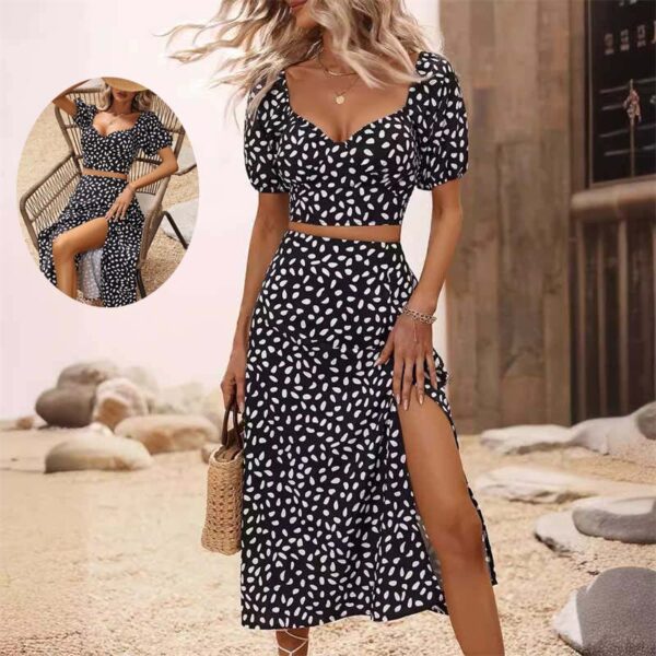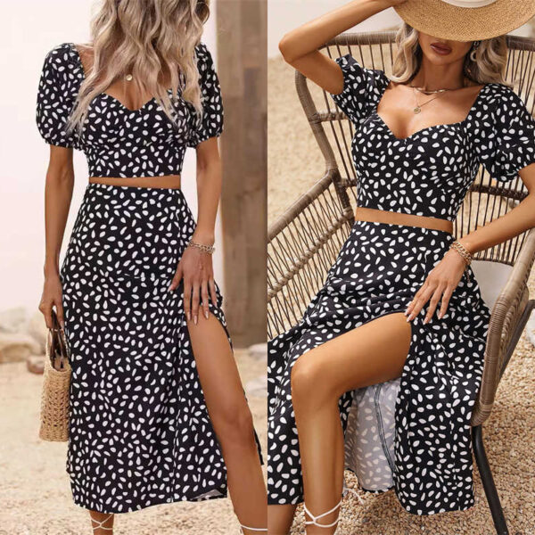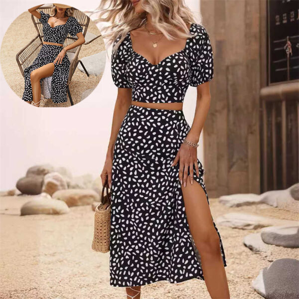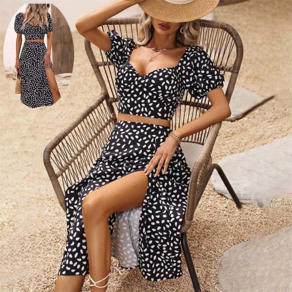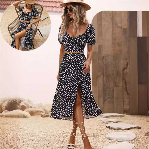 Summer Women’s Clothing V-neck Short Sleeve Split Skirt Suit Printing Long Dress