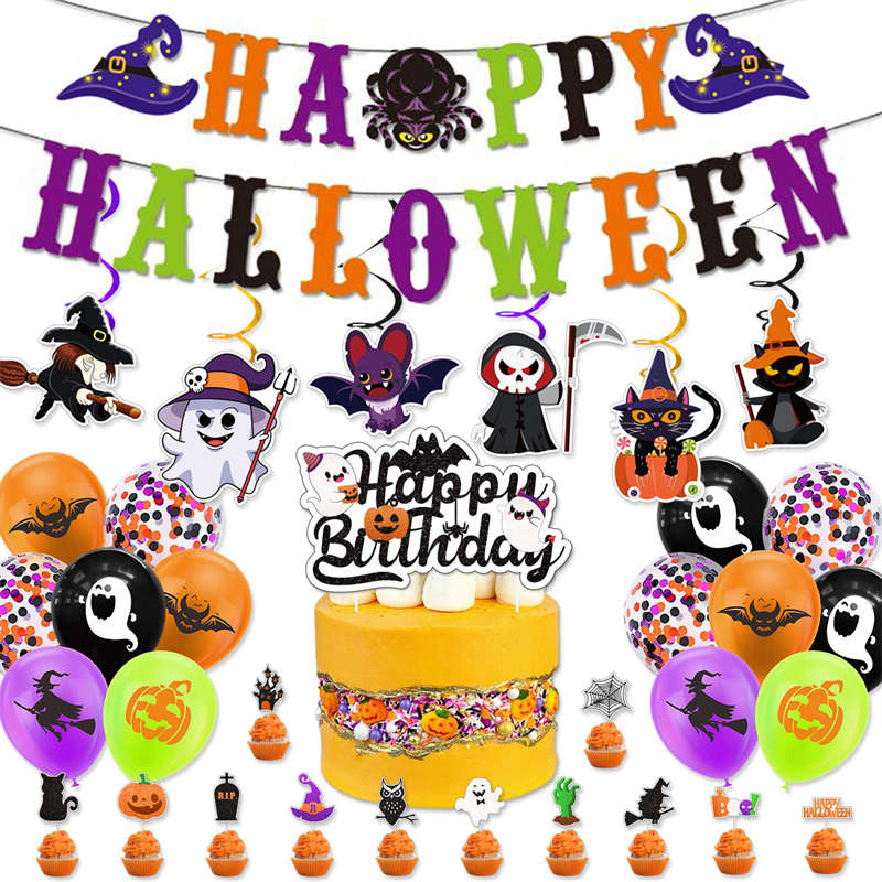 Halloween Hanging Flag Balloon Set Ghost Wizard Cake Inserting Card Bat Death Spiral Ornaments