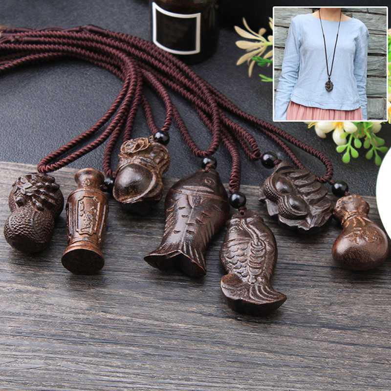 1Pcs Vintage Ethnic Handmade Wood Carving Fish Pendant Necklaces Women Men Adjustable Long Rope Chain Sweater Necklace Gift