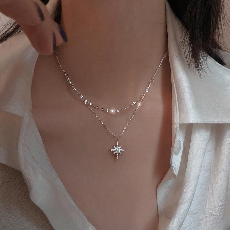 Silver Star Moon Double Necklace Women Clavicle Chain Shiny Diamond Fashion Jewely Accessories